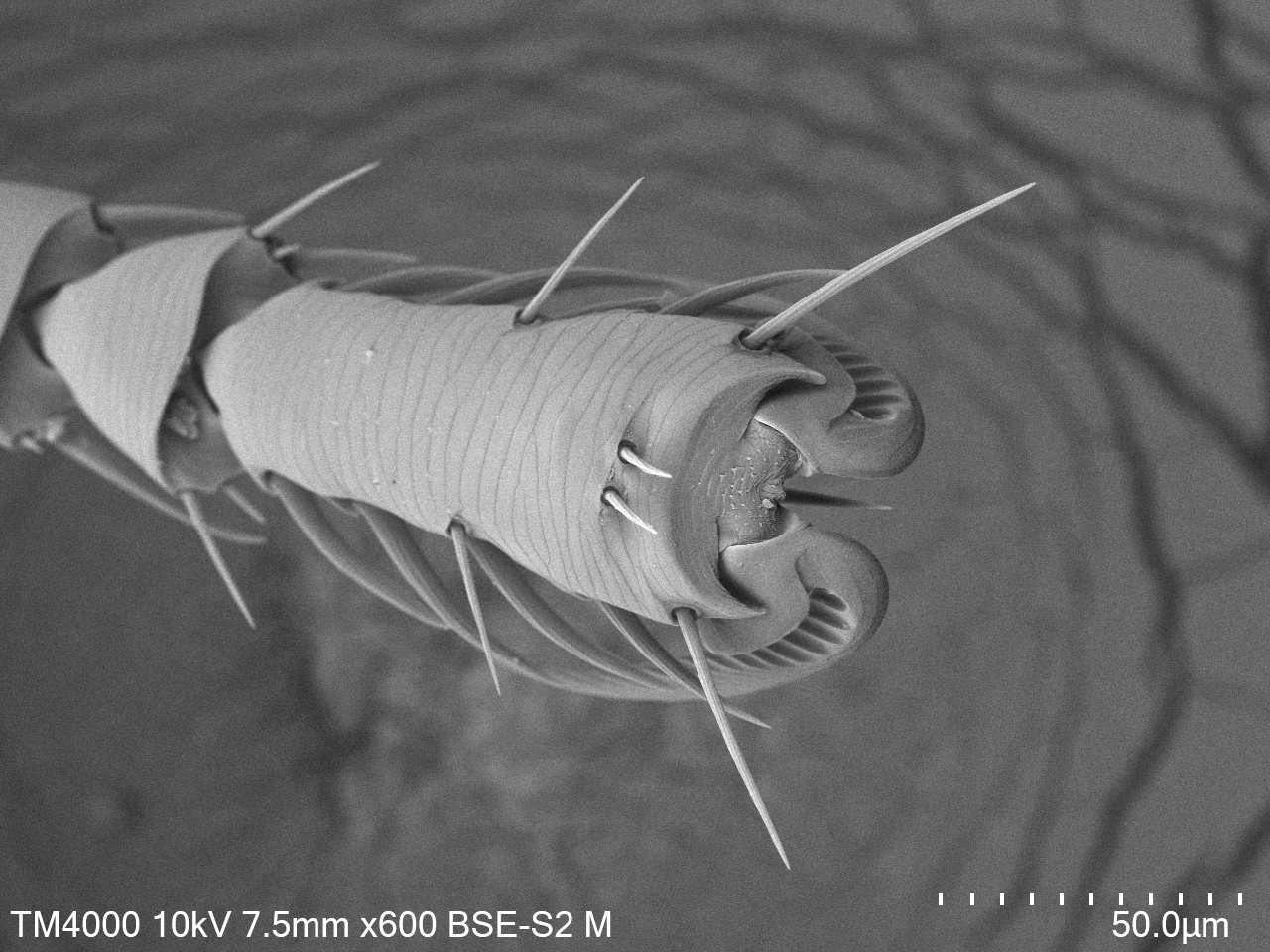 (Image caption above): Tarsus of dog flea (Ctenocephalides canis) imaged with a combination of UVD and BSED detector (capturing SE and BSE signals)