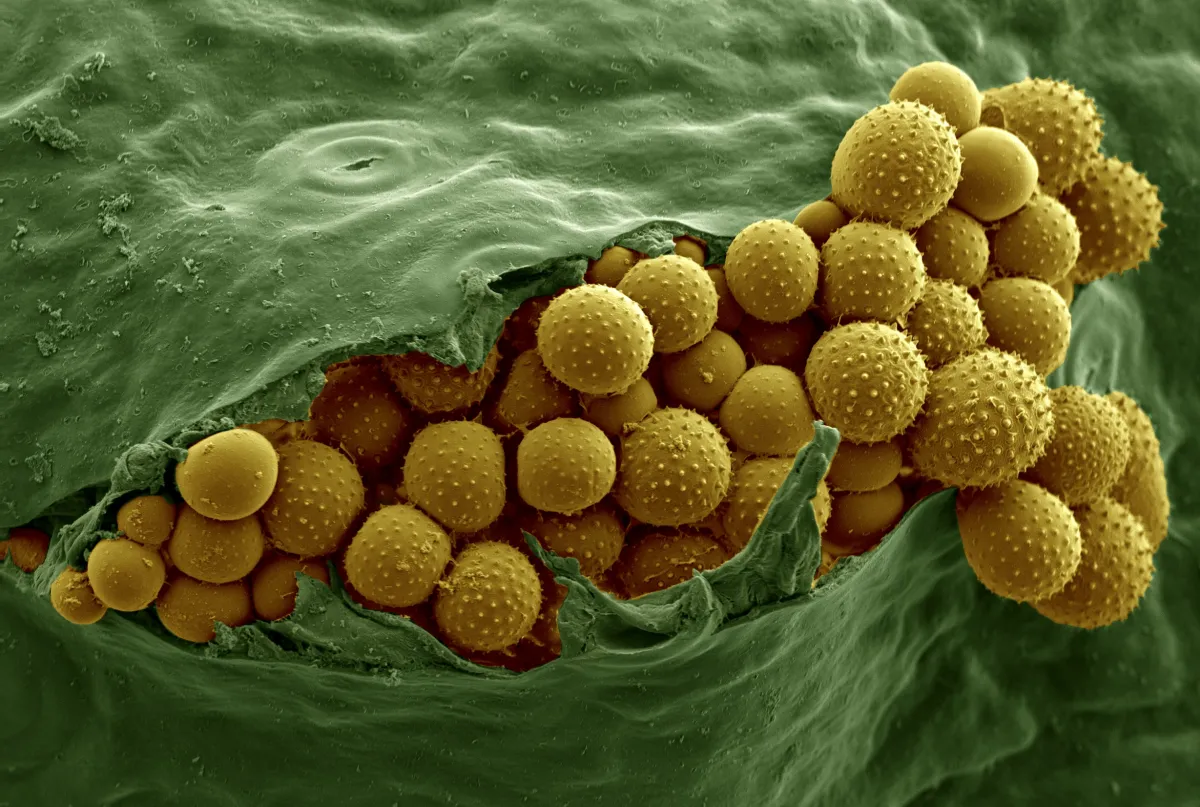A ZEISS UltraPlus FESEM image showing myrtle rust spores (coloured yellow) bursting out of a rose-apple leaf (coloured green) by tearing through the epidermis.