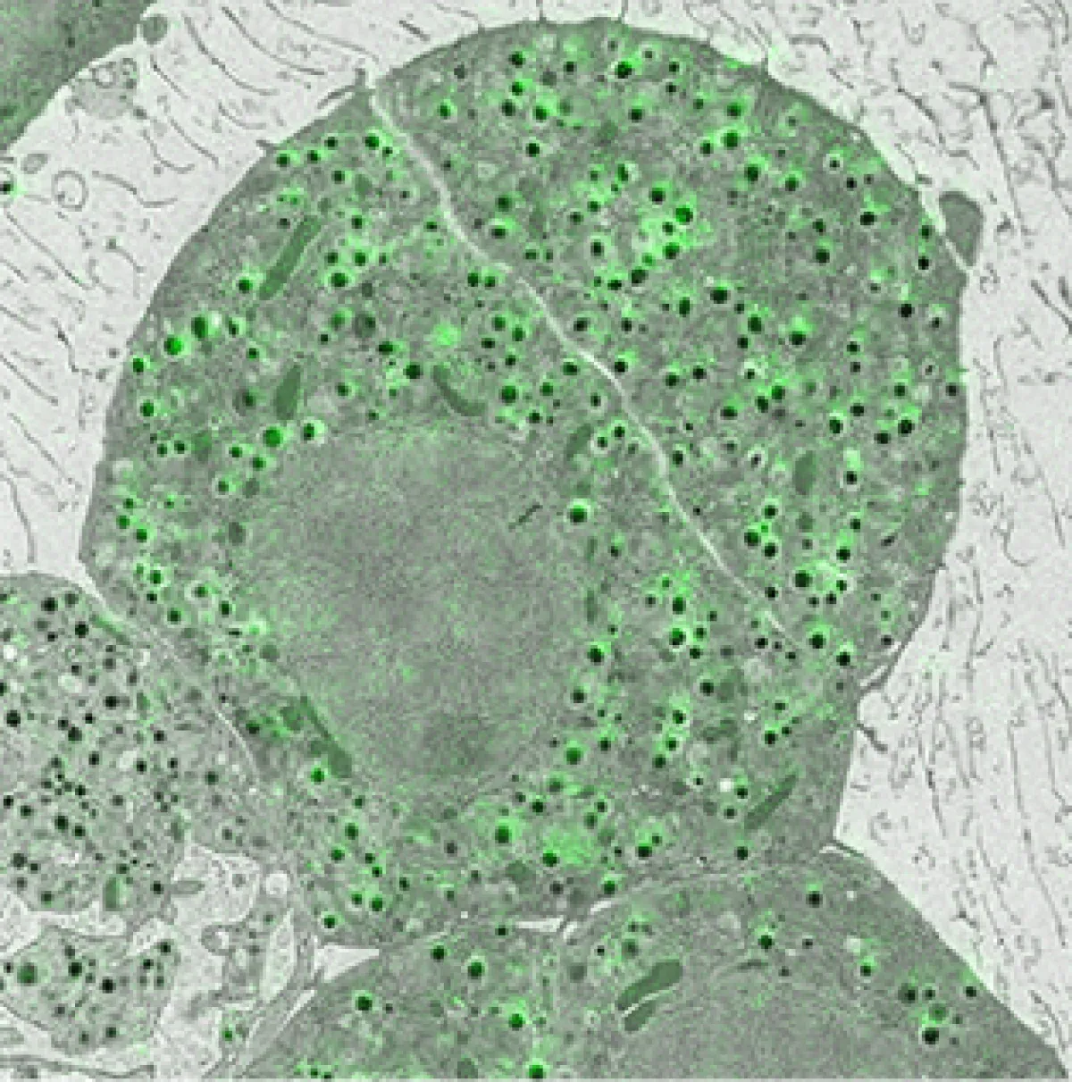 During the light microscopical analysis, we can make use of fluorescent markers in live or fixed cells and the subsequent electron microscopical examination of the same sample area provides detailed ultrastructural context of the features of interest. This technique allows us to study rare cellular structures and dynamic processes in cells and often provides unique information.