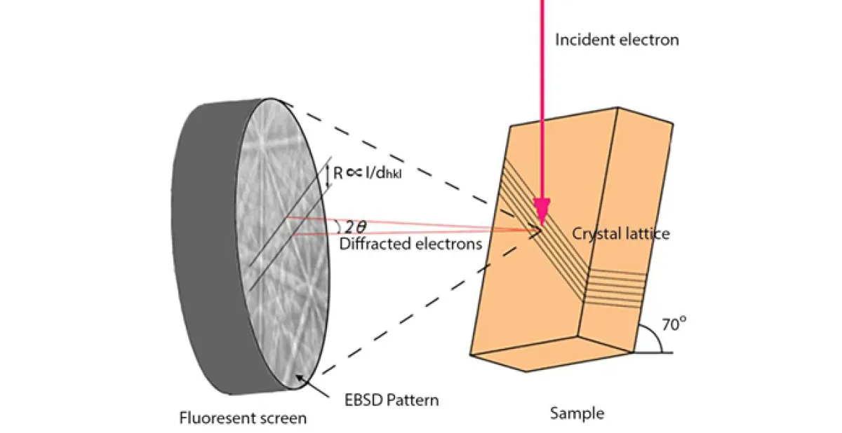 Electron Backscatter Diffraction (EBSD) is a technique available in the SEM whereby a focused electron beam impinges on a highly inclined (70°) crystalline surface (Figure 1).